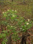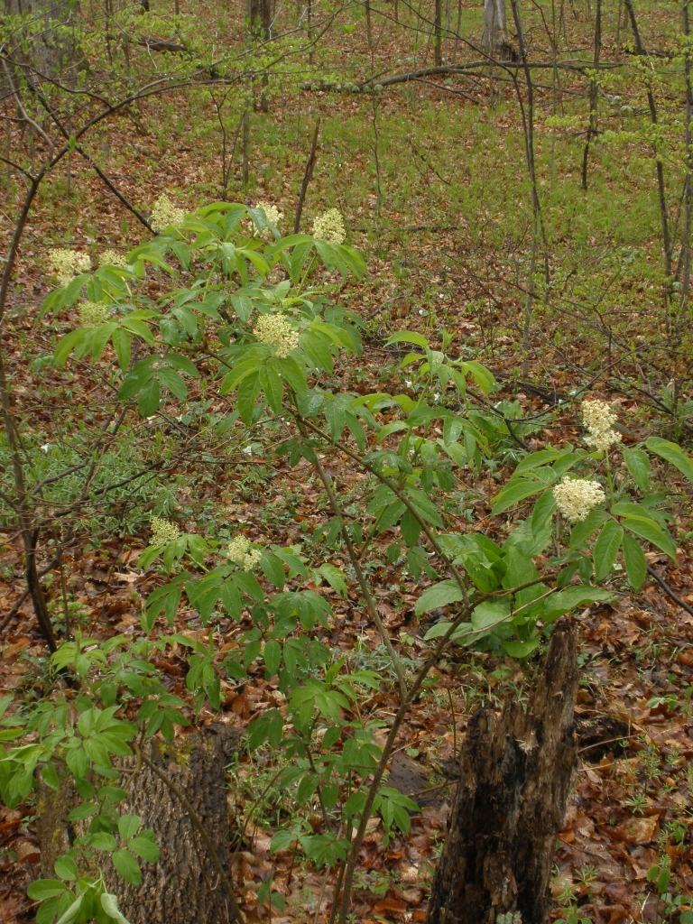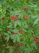 Notes: upright shrub with rounded form; compound leaves; flowers in early spring; red berries in June, good food for birds; fast-growing.